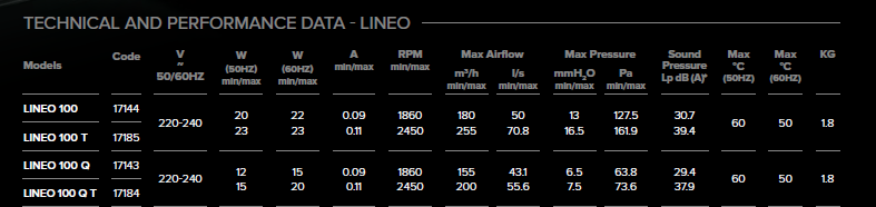 - IP44 koruma sınıfı Fan performansı, standartları ve ses seviyeleri uluslar arası akredite kuruluşu IMQ (Quality Mark Institute), tarafından sertifikalandırılmıştır. Çevre dostu düşük çevresel etkiyi garanti eder. Geri dönüştürülebilir malzemeler kullanılmıştır. (2002/96/EC - WEEE).